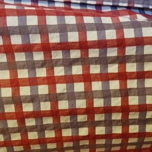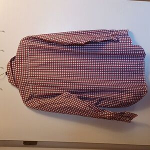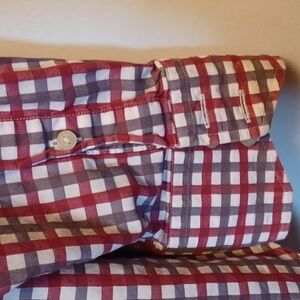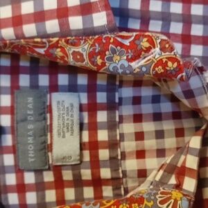 THOMAS DEAN, BUTTON DOWN, LONG SLEEVE, PLAID SHIRT, RED'S GRAY'S AND WHITE, NICE LOOKING SHIRT. MEASUREMENTS ARE BELOW APPROX.