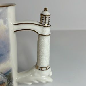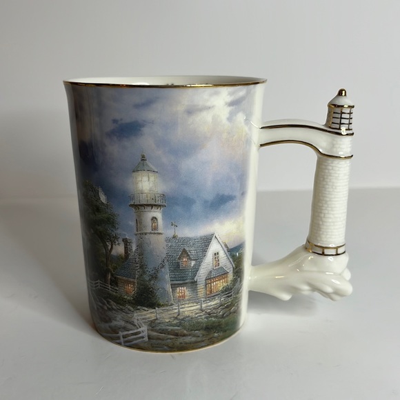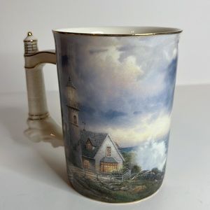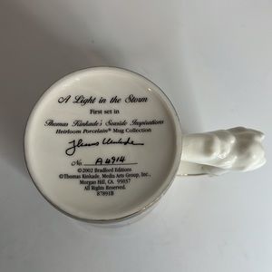 This is a listing for a Thomas Kinkade Lighthouse mug called A Light in the Storm. It is from the first set in the Thomas Kinkade's Seaside Inspirations Heirloom Porcelain Mug Collection. It is number B4B14. Copyright is 2002 by Bradford Edition. It is about 4.25 inches high. It is in good condition with no cracks or chips.