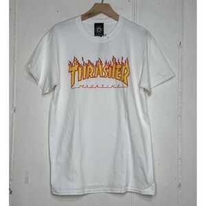 THRASHER Magazine Size M Short Sleeve Crew T Shirt White Orange Yellow Flame NEW