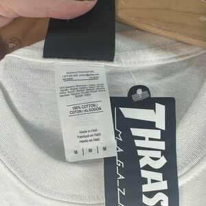 The THRASHER Magazine Size M Short Sleeve Crew T Shirt in white with orange and yellow flame graphics is a stylish and edgy addition to any wardrobe. Made from 100% cotton, this regular fit shirt features a classic crew neck and is machine washable for easy care. The flame pattern adds a touch of fire to the design, perfect for fans of motorcycle, rock, punk, and grunge music. With a nod to California culture and a hint of retro appeal, this shirt is a versatile choice for those who love a mix of hip hop and nerd themes.