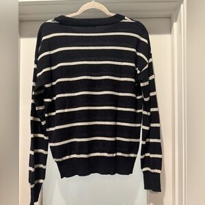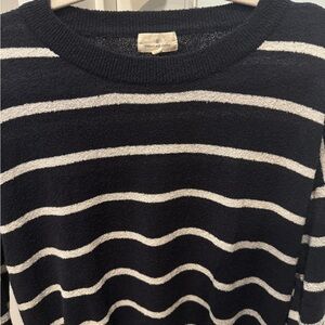 What a fun nautical sweater! Navy and white sailor stripe such a classic and preppy style. Material has a nice nubby texture that makes you think of the beach and ocean. This is a sweater if you are costal grandma, resort wear, preppy, cruise wear and classic and timeless!