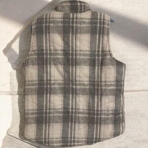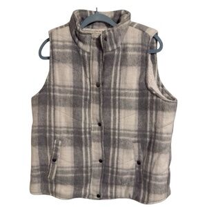 Stylish plaid sleeveless vest. Features a gray and cream color scheme. Perfect for layering. Like new