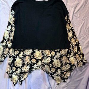 Round neckline, 3/4 sleeves w/ ruffled elasticized wrists, front/back L & R longer than front/back center, soft sweater-like body & chiffon-like trim