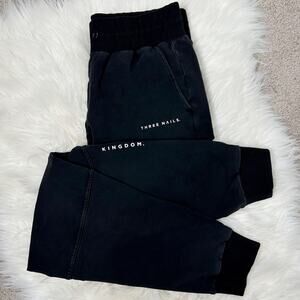 Black sweatpants joggers with elastic waistband, tapered legs with elastic fitted hems at ankles. Quality, soft, stretchy material. White graphic on front left side of the word "THREE NAILS" and same graphic on back of right leg that says "KINGDOM." Two side slant pockets, one side pocket on right hip, zippered back pocket on left side.