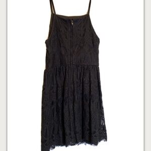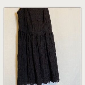 THREE PINK HEARTS Pre-Owned Size M Dressy Black Lace Fit & Flare Dress. Spaghetti straps, and delicate lace make this the perfect dress to wear on special occasions. Lined, Back Zipper, Fringe at the bottom and throughout the dress. Armpit to armpit measures approx 14.5” wide. Top of spaghetti strap peak, to bottom hem measures approx 32.5” long.