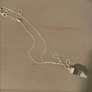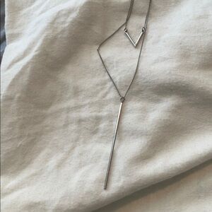 Set of 3 silver necklaces. The first one is a layered geometric necklace with a bar on the longer portion and v upper. Next is a faux gray crystal. The other necklace is an arrowhead. These necklaces can be layered with more for a fun look.