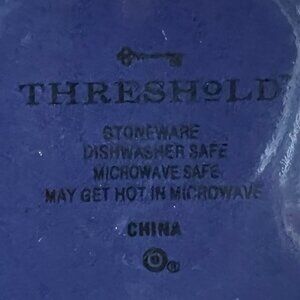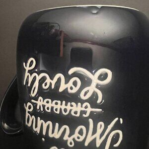Cobalt blue stoneware mug with fancy white incised text that reads, Good Morning CRABBY (with a line through CRABBY and replaced by) Lovely (underneath). Stylish upswing handle. Dishwasher and microwave safe. Measures 4” tall with a 3” diameter; 4.75” across including handle. Holds 14 fluid oz. By Threshold. Please note that there is a small area near the mug base that the manufacturer's glaze did not completely coat. As it is below the curve of the mug, it is not visible unless the mug is turned upside down. See Photo.