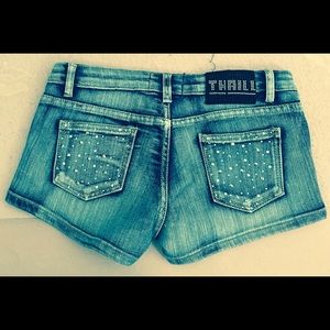 Incredibly Adorable Jean Shorts from THRILL amazing rhinestone detailing on the front and back pockets. Super cute wash with some distressing to give the short a little extra flare.