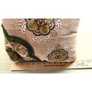 Nice throw pillow by Pier 1 Imports. This is a 16"x12" tan and green pillow with a lot of beading and textured crewel like stitching on various parts of the pattern. This is a pretty pillow with a few of the beads missing. There are a lot so it is not noticeable. I believe it is only in the two areas I have taken pictures of (see last two pictures) but there could possibly be one or two missing that are not noticeable. The pillow is not perfect, but it is still a really nice unique vintage pillow from Pier 1 Imports for a great price.