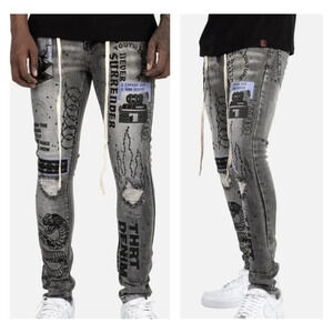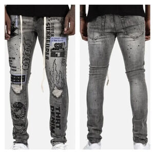 Stand out in style with THRT's Graphic Paint Splatter Serpent Jeans! Distressed gray denim, size 36. Embrace edgy fashion with a touch of urban flair.