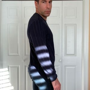 Dark blue with silver stripes long sleeve shirt. Zipper enclosure on sides. Dry clean. I’m a 48 inch chest and fits me perfectly.