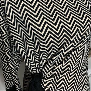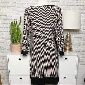 This TIANA B dress has that perfect mix of comfy and put-together. Black and cream chevron knit with a soft, lightweight sweater feel. The side tie pulls in the waist just enough and creates a flattering bit of ruching. Finished with black trim at the neckline, cuffs, and hem for a clean look. Easy to throw on with boots or flats and look like you actually tried.