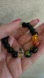 Stylish bracelet with black, red, green, yellow, and white beads. Features unique gold symbols.