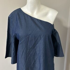 Lightweight 100% cotton denim, a single-shoulder bell sleeve shift lends to a more laidback yet dressy style. Just the right amount of edgy met with retined simple tailoring to pull it all together.