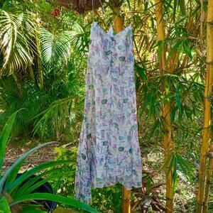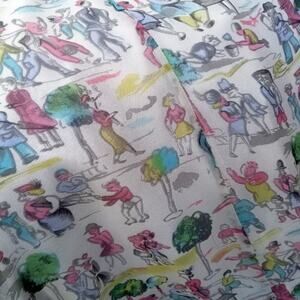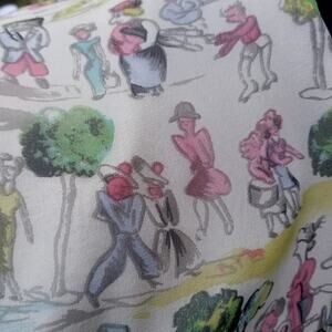 Tibi 100% silk slip dress in a cute & colorful print featuring watercolor style sketches of people doing random people things. Breezy sundress has spaghetti straps, is fully lined in white 100% cotton, and has an Asymmetrical Hemline, angled to one side. The silk is slightly stretchy. Tag Size: 6 (Small) pit to pit: 17" (34" circumference), waist: 15" (30" circumference). Excellent Condition. No Sign of Wear.