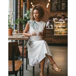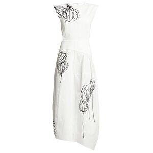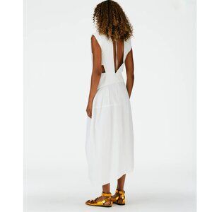 The 100% cotton dress engraved with a pigment print is for the Spring 2024 season. A fitted apron bodice with side cutouts showcasing just the right amount of skin and a semi-voluminous balloon bottom, combine many of our signature silhouettes, creating for something that feels equally familiar and special. The open back, tied simply at the top, offers another, unexpected reveal. Pair back to an interesting on trend summer sandal in an unexpected color (metallic orange fisherman style, as shown), to lean into experimentation with an otherwise more classic style.