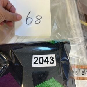 Stylish long sleeve dress with a vibrant geometric pattern. Features colors like purple, green, blue, and black.