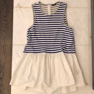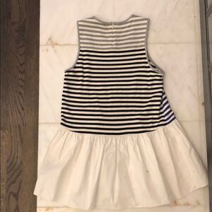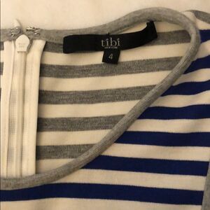 Blue, gray, white, striped Tibi peplum top! Excellent used condition! Size 4. Top portion has a bit of stretch! Bottom peplum is super flattering — looks great with white jeans blue jeans or pants. Loved this top but time for its next owner! Great top to wear to work, wear to brunch, wear on a date - stripes are so preppy and nautical! Could also wear under a blazer!