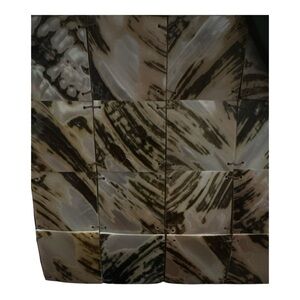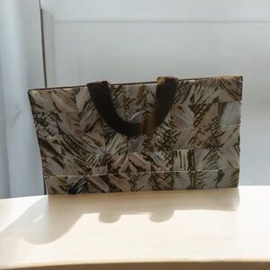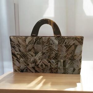 Make a bold statement with this TICO Collection shell tile handbag featuring a rich tortoiseshell-style design. The dark, swirling tiles reflect light beautifully, creating a sophisticated yet earthy vibe. Perfect for vintage lovers and statement bag collectors. Structured silhouette with snap closure and satin-lined interior.