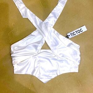 -“Keep Them Guessing Halter Top has a smooth satin construction, a halter neckline with adjustable tie neck straps, a keyhole cut-out on the front, and back hook closures.”