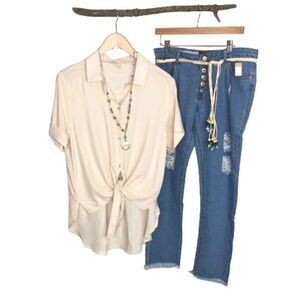 Our "Tie It On A Knot" woven top was made for you to wear without making you think twice of what to wear for the day. Designed with a relaxed fit with soft fabrication for it to drape nicely on the body. Easily closed with button on center front with collar, short sleeve with fold placket, side slit on bottom hem with high-low length.