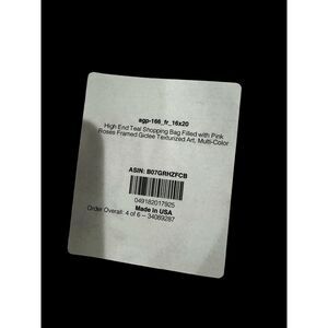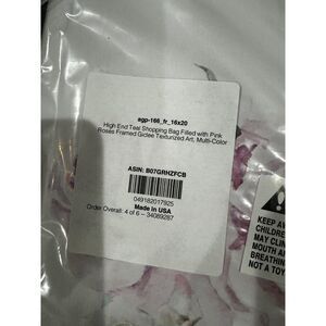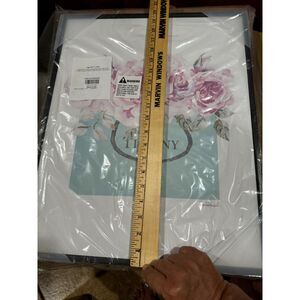 TIFFANY & CO SHOPPING BAG PICTURE WITH BLACK FRAME. HIGH END TEAL SHOPPING BAGFILED WITH PINK ROSES. FRMED GIDEE TEXTURIZED ARE, MULTI COLOR16 1/4" X 20". PICTURE HAS NOT BEEN TAKEN OUT OF PLASTIC.