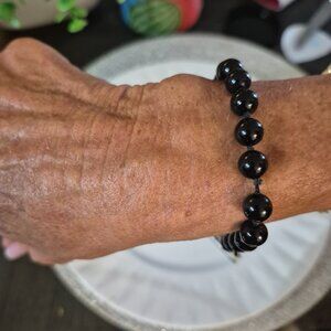 Material: Sterling silver and black onyx beads. The beads are made of onyx, which is a form of black chalcedony. The metal components, including the clasp, are sterling silver (925 purity). 9 inches