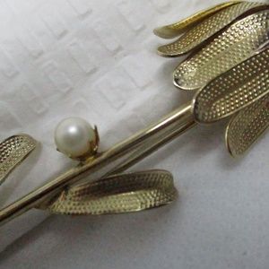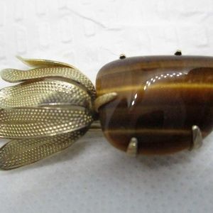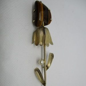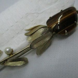 RARE HUGE Ornate never worn vintage 1950's huge prong set tiger eye gemstone prong set genuine pearl gold tone metal flower brooch. Length 4 & 1/2 inches. Width 15/16 inch. Depth 1/4 inch.