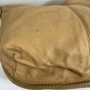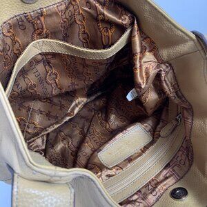 This stylish Tignanello hobo shoulder bag features a camel tan leather exterior with a convenient zipper and magnetic closure. Perfect for everyday use, it offers both functionality and elegance, making it a must-have accessory for any outfit.