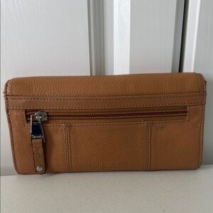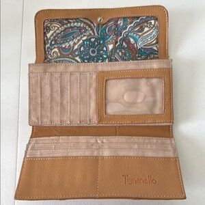 TIGNANELLO tan leather 7-1/2” wallet. The wallet has 10 slides for cards, an area for your checkbook, currency and a zippered coin pocket. Please see all photos.