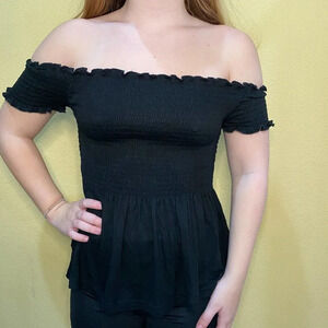 Black stretch off shoulder top with peplum bottom. Size small. New with tags.