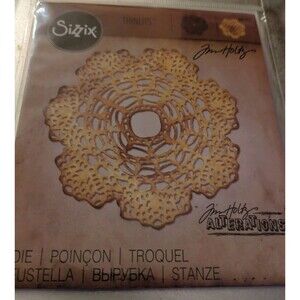 The item shown is a Sizzix Thinlits Die, specifically the "Doily" design by Tim Holtz. It's a wafer-thin, chemically-etched die used for cutting detailed shapes in paper, cardstock, vellum, or metallic foil for crafting projects.
