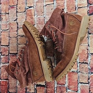 SELLING A GREAT PAIR OF WOMENS SIZE 8, TIMBERLAND ROLLTOP BOOTS, THE COLORS ARE RUSTY LEATHER WITH TAN GUM SOLES AND RED AND TAN TONE LACES, THE CONDITION IS VERY GOOD USED AS SHOWN IN THE PICTURES, PLEASE ANY QUESTIONS YOU MAY HAVE, BUNDLE UP AND SAVE OR REASONABLE OFFERS ALWAYS CONSIDERED THANKS FOR SHOPPING MY CLOSET AND HAVE A GREAT DAY ๐๐