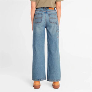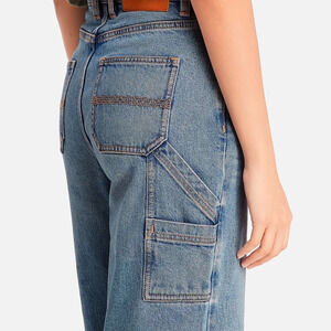 Part of the Timberland CF Stead Indigo Suede collection, the women's carpenter-style denim jeans are the ultimate expression of workwear style. The comfortable cut silhouette immediately offers an optimal fit thanks to the exclusive cotton blend, with 31% lyocell Tencel with Refibra technology, a fiber made of 70% wood pulp from sustainable sources and 30% recycled cotton from waste workmanship, and a touch of stretch for added comfort and durability. The buttoned flap and numerous pockets with an unmistakable workwear style combine form and functionality for an impeccable look.