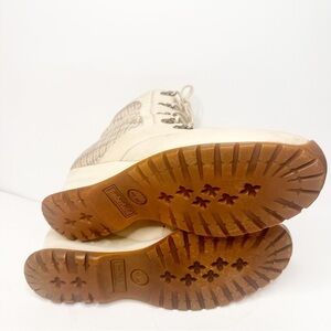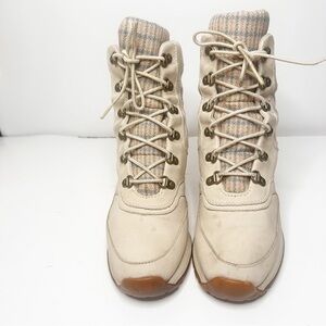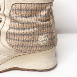 TIMBERLAND SUEDE AND PLAID FABRIC BOOTS WEDGE SZ 7 Suede leather and plaid fabric uppers with 2.25" hard rubber wedge heels. They have a lace up front and tongue matches the plaid on the sides. Color is between a white and cream and the plaid has some pink and green. A few light marks on the suede from normal use otherwise in very good