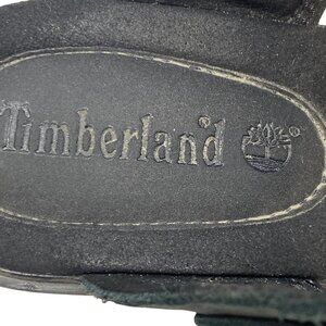 This is a pair of women's Timberland platform sandals in size 8, featuring a solid black color with a wedge heel style. The sandals are designed with a leather upper and outsole material, and they fasten with a buckle closure. The model of these stylish sandals is the TIMBERLAND Koralyn, perfect for adding a touch of sophistication to any outfit.