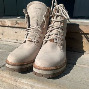 Gorgeous pair of light suede Timberlands with rose gold.