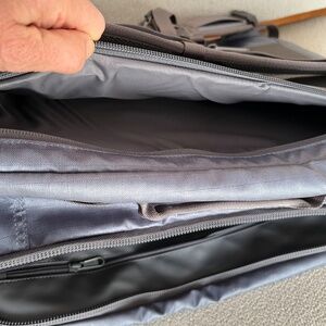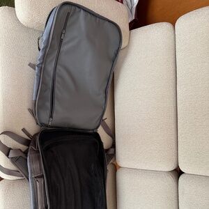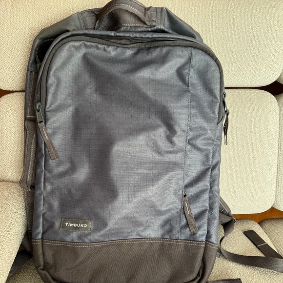Perfect travel backpack by TIMBUK2. Excellent condition. Lovely gray. Amazing for organization with easy access compartment for laptop, zips around to open flat, separate compartment for smaller items-keys/wallet/makeup, etc. Comfy padded shoulder straps. Side handles and water resistant bottoms. Outside pocket for papers, passport. Perfect size for carry on.
