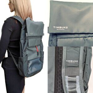 Timbuk2 large backpack, green-ish tone, huge interior compartment plus side pockets, plus 2 front pockets with zippers, super wide and comfy, adjustable straps. Highly expandable, mannequin wears the backpack with nothing in it. Note: the backpack has several mesh areas which show up like little rainbow circles - these are NOT actually present, it's just an artifact from taking photos.