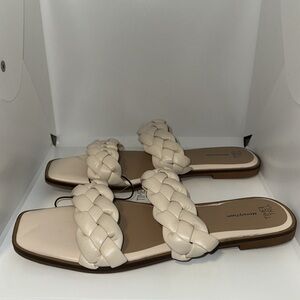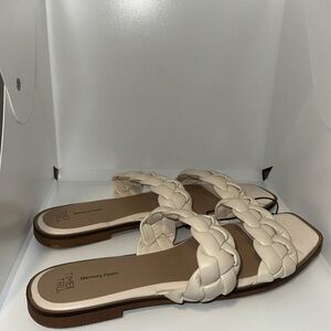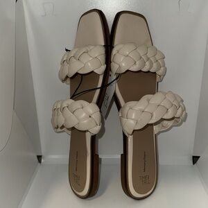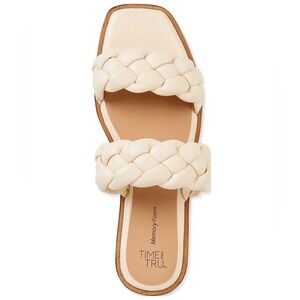 NWT TIME AND TRU BRAIDED Slides SANDALS Vegan Leather Women’s 11 Ivory Cream. Vegan leather upper, braided two strap design, slip on, open square toe, memory foam footbed. A few scuffs, or shelf wear. Perfect for Summer!