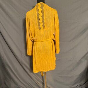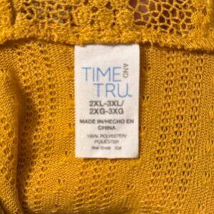 The TIME AND TRU Cardigan in size 2X-3X is a stylish and versatile piece for plus-sized women. This solid mustard yellow sweater features an open-knit design, long sleeves, and a V-neckline, providing a comfortable and on-trend look. The cardigan is lightweight, belted, and adjustable, making it perfect for layering and adding a pop of color to any outfit. Made by the brand Time and Tru, this cardigan is a must-have for any woman's wardrobe.