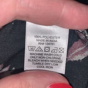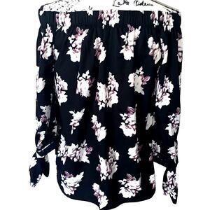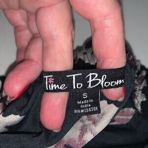 Time to Bloom brand top. This charming top features a beautiful black flowered design and a comfortable stretch collar. It's perfect for adding a touch of elegance to any outfit!