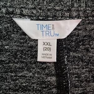This TIME & TRU Hacci Pullover Black & Gray Casual Long Sleeve Top is in excellent preowned condition. It is a women's plus size XXL. Lightweight and flowy. Very comfortable! 48% rayon, 28% polyester, 20% recycled polyester, 4% spandex. Machine washable.