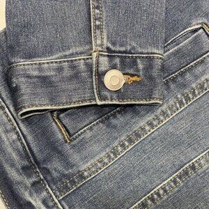 TIME & TRU ~ Jean Jacket Stretch Denim. Women's size Medium. Medium-wash stretch denim. Silver metal buttons. Front button and flap chest pockets and slant pockets.