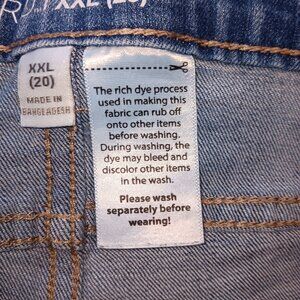 Made in Bangladesh, 5 pocket Design, size 2x or XXL, 70 % Cotton, 20% polyester, 9% Rayon, 1% spandex