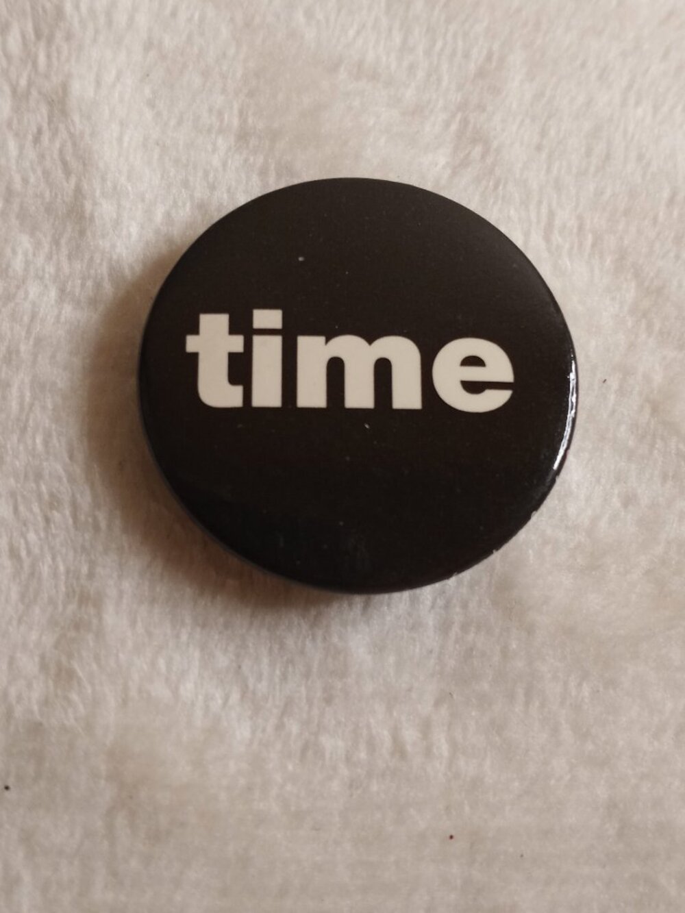 This is a black and white button pin depicting the word TIME.
