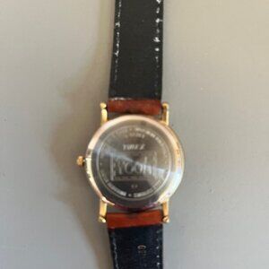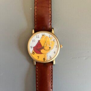 This vintage Timex Disney watch features a charming Winnie the Pooh design, gold-tone case, and brown genuine leather band, adding character and nostalgia to your accessory collection. • Gold-tone round case • Brown textured genuine leather band • Quartz analog movement • Water resistant • Stainless steel back • Adjustable buckle closure