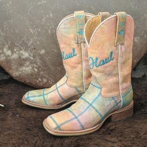 TIN HAUL "Hippie Check" pale orange & turquoise cowgirl boots square toe sz 9.5