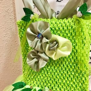 TINKERBELL couture tutu dress/costume - custom made couture, super cute hand-tied full and fluffy tutu dress with petal-like skirt, coordinating satin ribbon roses with pearl and rhinestone embellishments, green glitter leaves at the waist, satin straps with wide satin back bow. *(available in classic short length) Additional sizes available (3 mo to 10 yr at www.adinaballerina.com)
