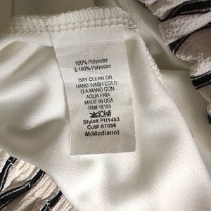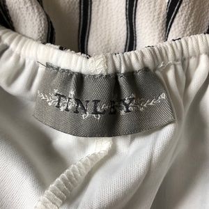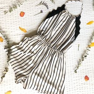 White and black pin striped romper by TINLEY, super cute w/ complete open back and great front coverage. You can tie the top to adjust fit on torso. Waist band has a scrunch effect, shows off curves & waist. Cute lacey Detail on the left and right sides of the front side. GREAT CONDITION, worn ONCE.